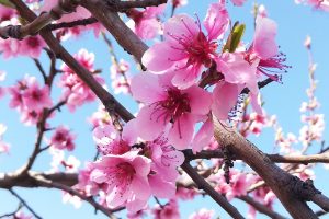 Las hojas del almendro son lanceoladas, de color verde brillante, y miden entre 7 y 12 centímetros de largo. Estas hojas caen en otoño, dejando el árbol desnudo hasta la primavera, cuando brotan nuevas hojas y flores. Las flores del almendro son uno de sus aspectos más destacados. Aparecen a finales del invierno o principios de la primavera, antes que las hojas. Las flores son de color blanco o rosado y tienen cinco pétalos, con un aroma suave y agradable que atrae a polinizadores como las abejas.